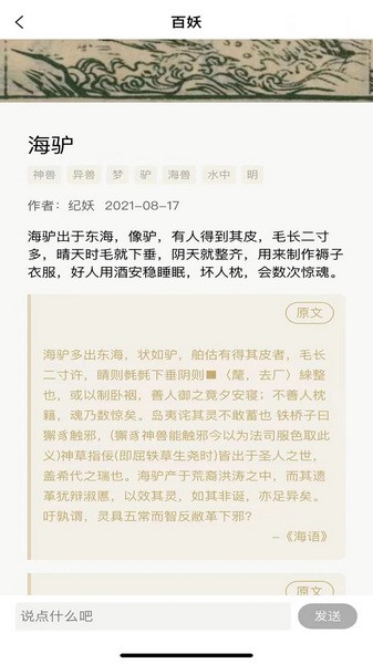 纪妖app官方版是一款囊括了大量精怪妖鬼介绍的软件,还有非常多的杂谈可以让大家浏览和阅读。只需要输入名称,大家就能够获得相关的介绍内容,还可以按照朝代顺序来搜索和查询。软件能够为网文作者们的写作提供一定的帮助,还有非常详细的文献和配图,包括妖怪们的特点描述。软件功能简单,使用方便,业余生活也能够了解更多古代志怪。