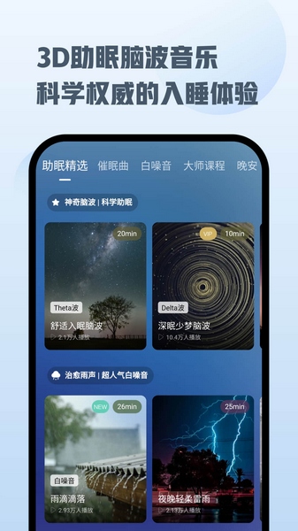 3D脑波音乐,这里的助眠音乐都是3D脑波音乐可以对用户进行声学诱导从而帮助其睡眠改善;
