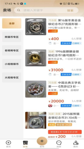 通过卖场专区可以查看不同品类的纪念币信息,根据分类找到不同品类的纪念币;