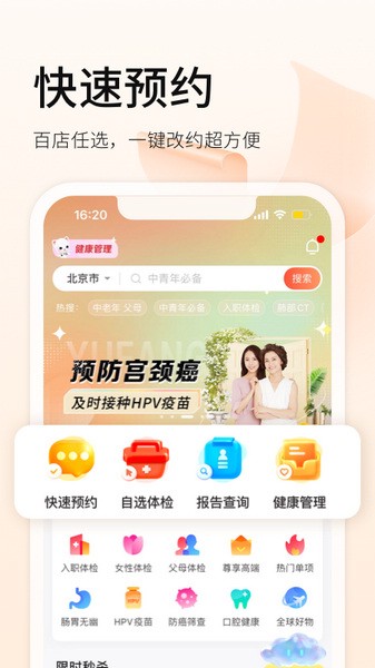 1. 购买体检:提供多种多样的体检套餐、齿科、疫苗服务供用户购买及预约。