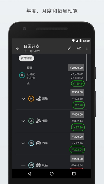 - 预算:将您的支出与每个类别 (每天、每周、每月或每年) 设置的限额进行比较。