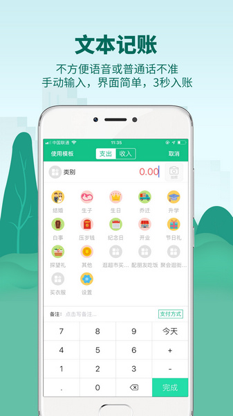 文本记账:不方便语音或普通话不准,手动输入,界面简单,3秒入账