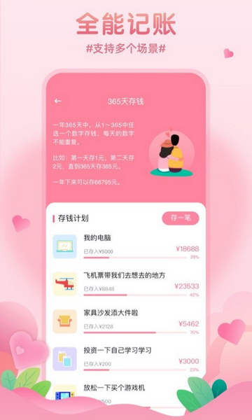 【全能记账】支持365天全年存钱,能够针对多个场景进行记录,让记账更加具有针对性,通过多个场景的记账,让你的记账计划能够更快的实现,早日到达目标!