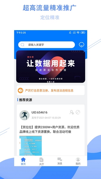 赏乐帮APP是一款主打客源获取的软件,其可以帮助各大企业有效推广自家产品信息,并整合了全网零散、闲置的海量媒体资源,让企业能更清晰的看到时长需求,并获取人脉、资源力量,且软件还可对信息进行智能分析,提供自动匹配、商机挖掘等服务,实现上下产业链对接,在提升工作效率的同时有效减低成本!