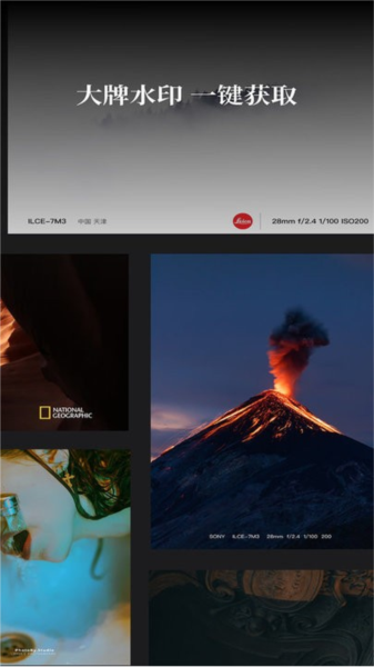 提供索尼水印、徕卡水印、哈苏水印等摄影师和摄影爱好者常用的水印,并且能够自动识别图片信息,批量添加水印,输出原画质照片。
