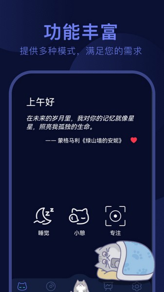完成睡眠计划即可解锁各类猫咪食物、道具、装饰,见证猫咪成长,与猫咪快乐互动。