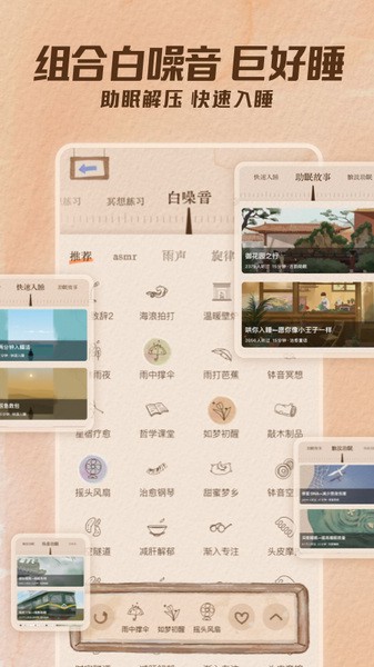 优质白噪音支持多款搭配,风、篝火、雨、流水、鸟鸣、虫鸣声打造你的专属睡前氛围,让你逃离浮躁都市,更快入睡,改善睡眠质量。首页灵动可爱的触发式环境白噪音彩蛋,等你破解。