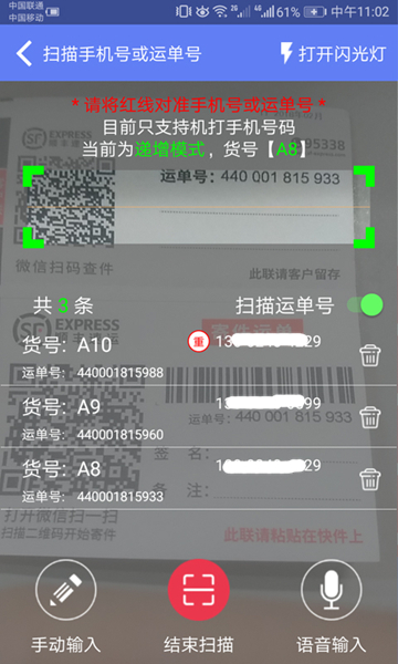 1.精准扫描:优化快递件手机号码扫描功能,准确率高达100%,大大提高快递员工作效率。