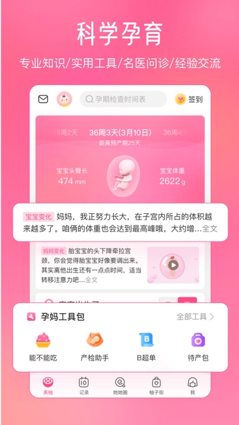 提供经期、备孕、怀孕、育儿四大模式。科学备孕,排卵日一查便知;健康怀孕,知识每日推送,食物能不能吃一查便知;育儿护航,记录宝宝成长每一刻。