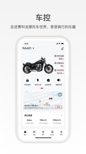 赛科龙app是一款专为赛科龙摩托车设计的智能化车联网应用,赛科龙摩托车将带您深入探索摩托车世界的无限魅力。该应用不仅能够帮助您实时远程控制摩托车的各项功能,还能为您提供详细的车辆信息和骑行状态,确保您随时随地都能掌握爱车的情况。