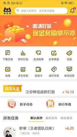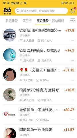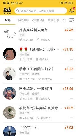 悬赏猫app是一款网络兼职赚钱软件,这里的任务多种多样,都是比较简单的,很快就能完成,所以报酬也不会太高,不过这里的任务数量很多。用户可以在这里截取自己想做的任务,然后在完成后即可获得佣金。而且这些任务还经过了分类,还能按照自己的要求来进行排序显示,让你快速找到适合自己的任务。而除了做任务外,你也可以发布悬赏来让别人帮忙做事。