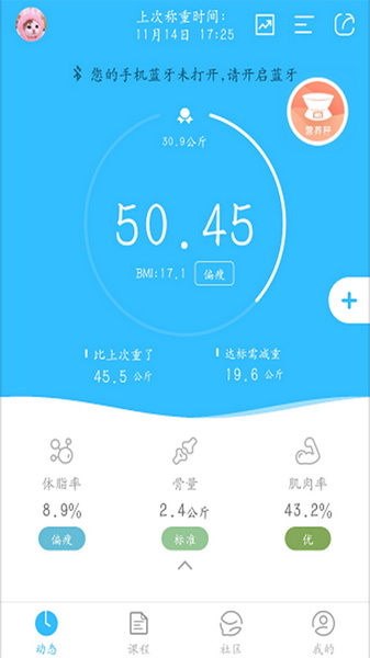 渐轻app是一款专业的体质和健康监测平台,用户可通过绑定家中对应的体脂称来获得自己现在的体重、体脂等信息。软件还能自动为你匹配符合当前体质的运动训练课程,从而帮助用户通过健康的方式达成减重、瘦身、塑形等目的。这里还有脂肪率、肌肉率、水分率等多个维度的身体参数和信息,用户可以在这里全面了解自己当前的身体各项情况,非常实用。