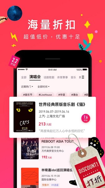摩天轮票务平台整合了主办方、各级票务公司、以及个人的闲置票源,实现平台上90%的演出都有打折票,为消费者提供更为实惠的观演选择。