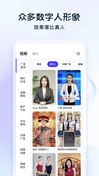 职业男女、阳光帅哥、古风美人、外国友人等众多数字人形象任你选择~数字人形象生动逼真,视频效果堪比真人实拍。还能一键切换视频背景,如替换为直播间、演播厅、销售展厅等场景,让你随心定制自己想要的视频效果。