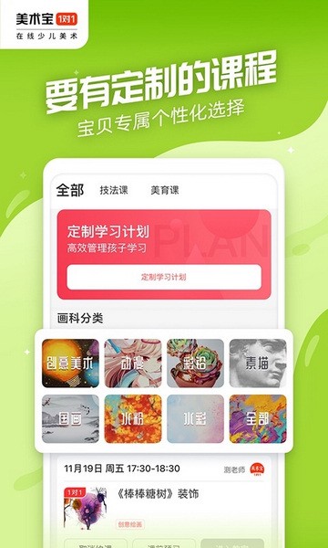 美术宝1对1app是一款能够为用户提供一对一的美术教学和辅导软件,大家能够在这里获得最新的艺术资讯,也可以学习各种美术小知识。软件针对不同年龄段的学员,能够提供包括技法课和美育课等不同侧重的课程安排。个性化的学习计划定制功能可以让大家获得更加专业系统的教学。根据不同的绘画类型,软件还提供有彩铅、素描和水彩、国画等分类。