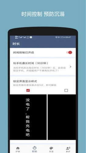 另外,APP还有定时关闭的功能,到了设定的时间会自动锁屏,这样就能避免长时间盯着手机不放。我觉得这对那些喜欢熬夜刷手机的人来说特别有用。它还支持很多种护眼模式,比如游戏、阅读、夜间等等,可以根据不同的使用场景选择合适的模式。