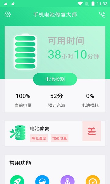 手机电池修复大师安卓版是一款专用于手机电池检测和优化修复的软件。这款软件能够通过专业的检测技术来分析用户手机电池的健康状况,根据检测数据来对不同的功能进行评分,让用户对手机电池的情况有更加清晰明了的了解。在检测之后可对电池各功能进行优化和保养,对问题部分进行修复,以提升电池的使用寿命,让用户的使用体验得到提升。