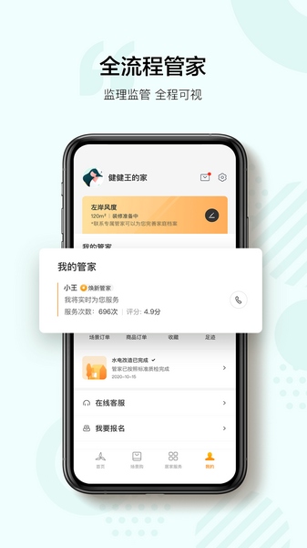 【全流程管家】提供1对1专属管家的一站式全流程服务,从设计、签单、施工、监理、交付全程由专业管家进行监管,为您严控工期和施工质量,提供透明公开的平台服务。并免费提供全程可视化系统,让您在繁忙的工作中不需要亲临现场就可以在线了解施工进程和查看施工现场;