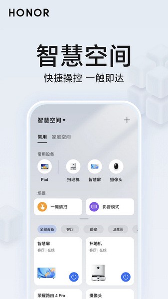 荣耀智慧空间App支持管理和控制多种智能设备,包括灯光、空调、电视、音箱等;用户可以通过一个集中的平台进行设备的统一管理和控制,方便快捷;