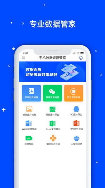 手机数据恢复管家是一款能够帮助用户们轻松找回丢失的文件和数据信息的工具,使用简单又方便,支持包括图片以及文档、视频和通话记录、联系人等在内的多种类型。针对不同用户们的使用需求,手机数据恢复管家app还提供了专业的工程师恢复选项,能够更好的找回所需要的文件资料等。操作上也非常的简单,一键扫描即可轻松完成恢复,大家也能够将找回的数据文件导出到本地。