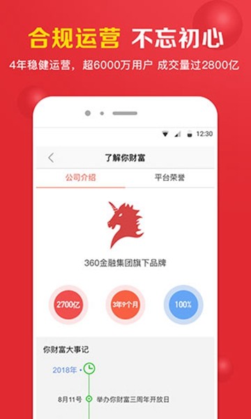 360你财富APP官方版是由北京奇虎三六零投资管理有限公司推出的一款金融理财服务平台,继承了360安全卫士的安全性,为用户提供了安全有保障的投资产品。360你财富由专业优秀的金融团体为顾客提供资产多重审核、实时风险监控等服务,保护客户信息安全,投资有保障。在360你财富,资产随存随取,用户可以随时查询自己账户的情况,安心理财投资,同时还能了解投资理财以及活动信息。