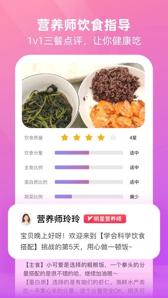 该app特色鲜明,亮点十足。明星导师课程让用户能找到最适合自己的健康方案;海量真实案例展示了成功者的经验,激励用户坚持;扫码解析食物配料表功能让饮食选择更透明,避免踩坑。营养师的专业点评和建议也为用户的饮食结构优化提供了科学指导。实用工具如饮食记录、热量查询等则帮助养成良好的生活习惯。