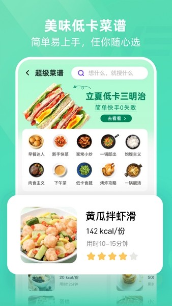 此外,app还提供各种低卡营养菜谱,涵盖早餐到晚餐,满足不同场景需求。界面设计简洁明了,用户数据一目了然。