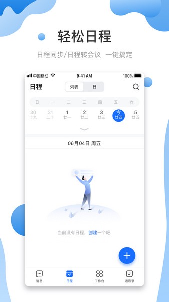 1、打开智悦轻舟app下载,到消息界面,点击西方菜单中的“日程”,然后点击右下角的“+”来创建新日程。