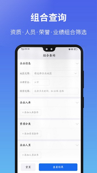 组合查询:组合【地区】、【备案】、【入库】、【资质】、【信用评价】、【人员】、【荣誉】、【业绩】的多维度综合查询,找到符合要求的企业;