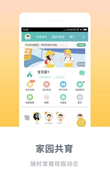 [宝贝考勤]:天宝宝入校离校拍照刷卡,家长及时在手机端收到通知及照片,实时掌控孩子去向。