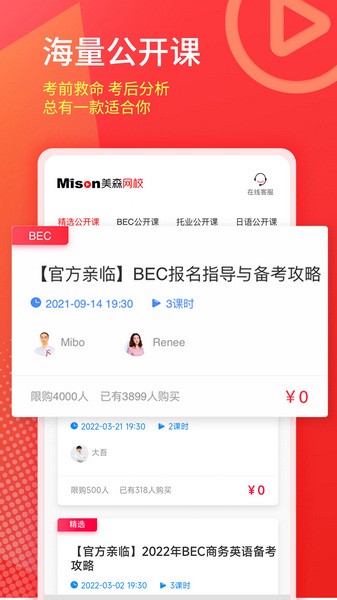 你想找的这里都有!甄选美森自研好课,高质量教师、丰富的课程,助你快速提升bec、托业、日语水平,掌握考试技巧、备考方法,轻松达成bec、托业等商务和职业能力英语、考级日语、兴趣日语的学习目标!