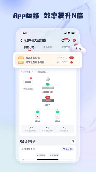 网络工程运维人员,无需到达现场,就可以通过App,实时的对网络进行监控和维护。