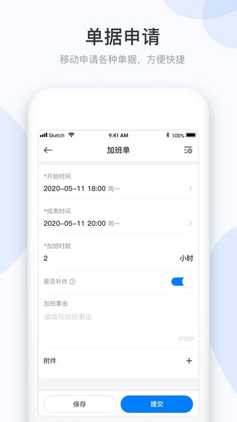 1、支持单据申请,请假单、出差单、加班单、销假单、签卡单;