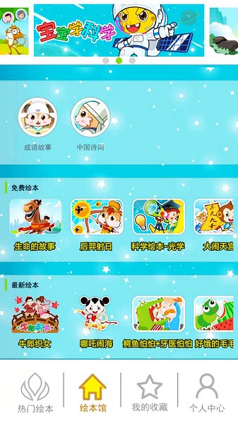 1、在首页中选择绘本馆,在绘本馆可以看到北奇星绘本软件还有成语故事、唐诗宋词、中英文绘本和经典绘本等分类;