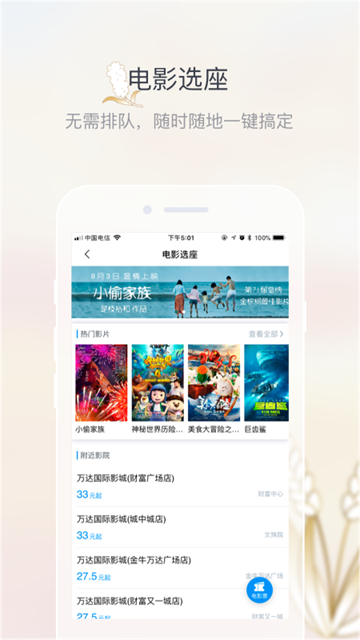 2、一站式的电影选座预订中心,里面推送展示近期丰富电影,还提供快捷预订和选座快捷操作;
