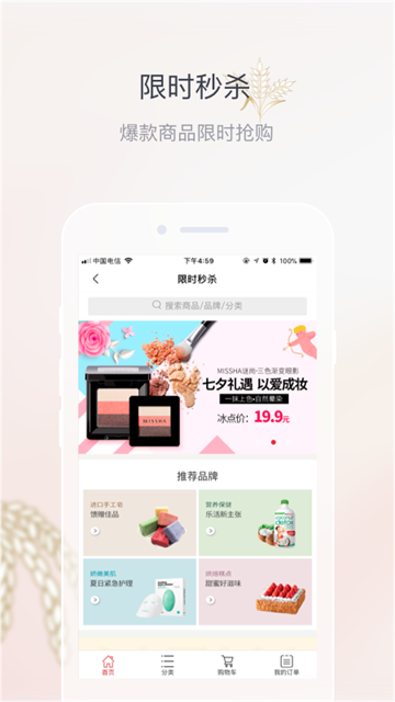 4、开设了限时秒杀的商城推送产品,这里面拥有丰富的百货商品资源,比如眼影、蛋糕以及护肤产品等;
