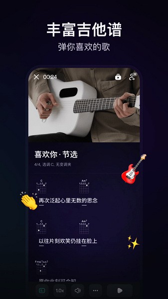 拿火app也可以叫做拿火智能吉他app、LAVA等,是一款十分不错且专业的吉他学习类软件,对于想要自学吉他的用户们来说是个不可多得的宝藏软件,其中不仅为大家提供了二十万多首吉他谱,并且每天还在实时更新,涵盖的曲谱类型多样,可以很好的满足吉他爱好者们的使用需求。此外,平台内还有专业的吉他老师们在线提供教学服务,帮助大家轻松提高自己的吉他水平。
