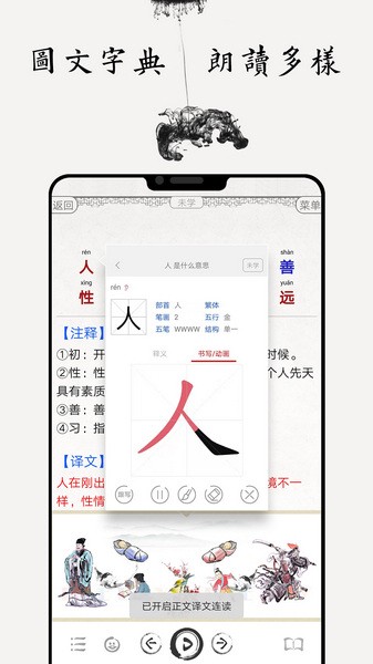 软件界面设计精美,采用水墨风插画配合内容讲解,学习起来更直观。它还有朗诵、跟读、默写等功能,可以让孩子在互动中加深理解。此外,软件还支持拼音显示、字体切换、播放速度调节等多种辅助功能,方便家长和孩子使用。