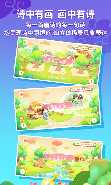 1、沉浸式体验:沉浸体验。每首诗中的每一句诗,都优化出更加优美趣味的场景,让孩子们完全沉浸在“诗中有画·画中有诗”的意境美之中;