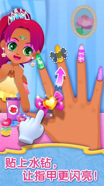 > 美甲设计:仔细修剪公主的指甲,为她的指甲点缀个性贴纸和珠光水钻,让指甲闪耀起来。