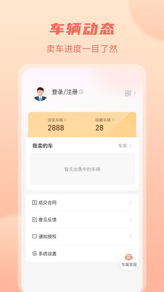 3、个人中心页可登录注册,能管理浏览收藏车辆、查看成交合同等,还设意见反馈和消息通知功能。