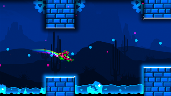 游戏中的跳跃也是要有技巧的,过早或者过完都会让你面临着撞墙危险,因此要找到合适的起跳时间。在这里,小编的方法是这样的,在心里默数,在靠近障碍物的前一秒让小方块跳跃,这样就能很好的躲掉障碍物。因此,在此小编觉得玩这款游戏需要在一个安静的环境下进行,便于你大概的计算方块合适的跳跃时间。