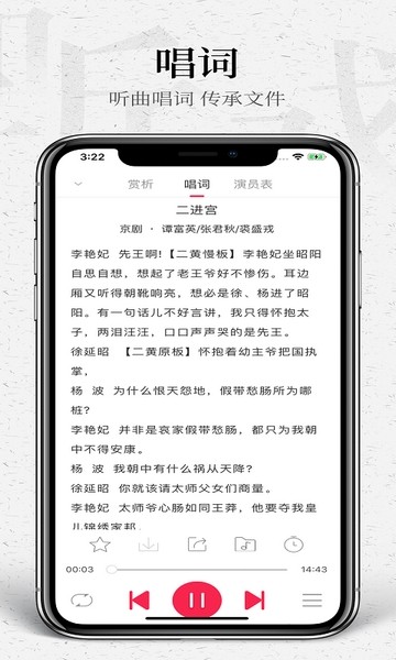 4、专业的戏曲内容,听戏为您提供了精准的唱词,以及专业的戏曲赏析,让您在听戏的同时体会学习戏曲背后的故事。