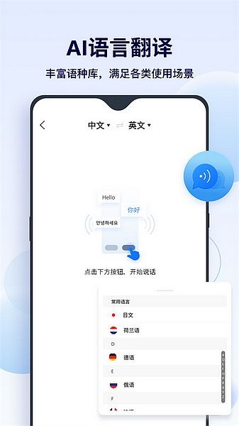 2、精度的翻译识别技术,一键将您输入的语音内容翻译成为您所需要的语言。