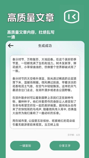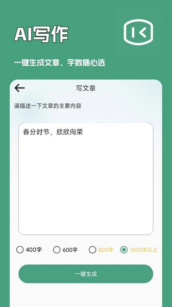一键文章生成器是一款集成了AI语言模型的应用程序,旨在帮助用户进行诗歌创作、解惑、出题,并提供聊天功能。不论您需要写作、学习、娱乐,抑或寻求智能化语言交流,这款应用都能满足您的需求。作为一个AI智能模型,与其互动可以带来更多灵感和启发,有助于提升思维和创造力。一键文章生成器APP提供全面的在线文章生成功能,包括各种写作模式和模板,涵盖作文、检讨、公文等内容。用户可以轻松体验智能的写作体验、大纲设计以及创作手段,同时享受智能角色设计带来的乐趣。