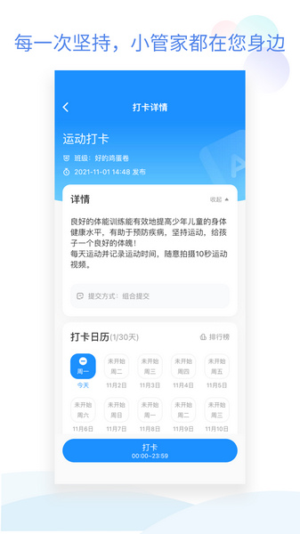 小管家除了以上功能以外,还支持线上任务反馈,发布日常打卡,智能跟读等等,帮助学生巩固成绩。