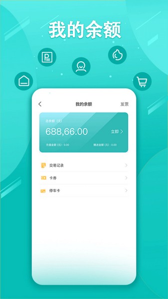 6、多种余额管理功能列表,里面有交易记录、卡券以及停车卡多种内容。