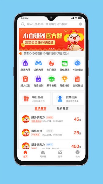 1、首先是悬赏大厅,里面有超多的悬赏任务等你来做,有微信业务、数据采集、高价实名、轻松助力、邀友收徒等等都可以赚取到不少的佣金