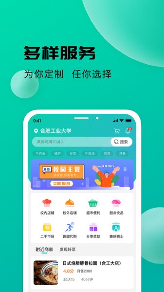 1、学校周边的优质商家全面覆盖,足不出户就可以在线查看详细的介绍,下单超省心;
