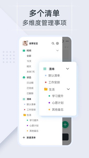 - 灵活排序:可自定义排序,也可按【状态、时间】排序,通过排序可以快捷查看【置顶、星标、近期或长期】事项,满足不同场景下的时间任务管理需要。
